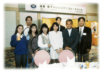 10月に行われた1996 エネルゲンCUP遠藤愛チャレンジテニストーナメントで長野県(名古屋ブロック)の代表として高輪プリンステニスセンターに行って来ました。このショットはパーティのときのものです。中央のキレイな女性が遠藤プロ、その右の男性が西尾プロです。(私は一番右で名札を付け、係りのように立っている)遠藤さんは本当にかわいい方でシャイな感じの人でした。こんな小柄な人が世界に出て戦っているのは、ちょっと信じられない感じでした。あとの人は新潟と兵庫の代表の方です。僕は全国大会は初めての経験で、とても他の地区のチャンピオンたちには歯が立たないんだろうなあと思っていたんですが、周りのすごいプレーを見ているうちに何か自分も同じように出来る気がして、自分じゃないみたいないいプレーが出来、2位グループの決勝まで行ってしまいました(お調子者の私!)ちなみに私達の予選グループの1位の大阪代表のペアは1位グループも優勝して、おまけに遠藤、西尾プロにも4-0で勝ってしまいました(スゴイ)これもみんな僕のペアの上条さんのおかげです。(写真中央遠藤プロのよこにいる人です。上条さんは1996長野県ランキング第1位!)上条さんありがとう!それから東京まで一緒に行って応援してくれたみなさんありがとう!