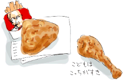 子供と3人でケンタッキーに行った。茜はかならずカーネルと握手をする。6ピースのチキンの中から“好きなのを取りな”と言うと足のところを取っていく。ぼくはしめしめと思い三角のところを食べる。