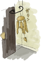 エスニックな風鈴をみつけた。玄関のドアが開いたら鳴るようにするのにとっても知恵をしぼって、けっきょく鉄筋を手曲げして取りつけた。なかなかいい音。