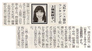 美枝子さんは一美がレッスンを受けていたこともあってペアを組んでもらった。すでに何年も女子長野県No1だったので、どの相手も“お手柔らかに、マイリマシタ”と最初から負けるものと思って来た。これが強い人から見る風景なんだなぁと思った。どの試合も1ポイントもあげないという試合内容ですぐ終わり、いつもあっというまに決勝戦だった。そんな美枝子さんにお調子者の僕は、いつもできないプレーが不思議とできて“僕ってけっこうやるじゃん”なんて調子に乗っていつも楽しい試合だった。県内の大会は2年間くらい全部優勝だった。必ず一緒にフセさんテラダさんの役者つきの北海道・東京にいった全国大会は新宿駅ではなればなれになったり、レセプションでパンをビニール袋に山ほど持ち帰ってきたり・・楽しくて楽しくて忘れられない。小さくてポーチにどんどん出るのになんで後ろ抜かれないの?って今でもわからない。いつもこんな僕をおだてて力づけてくれた笑顔。試合の後ギューと握手してびっくりする相手の顔。何もかももう見られない。でもありがとう美枝子さん。ありがとう。ありがとう。