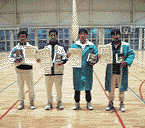 夢の初優勝か!と思ったけど残念ながら2位。決勝は、スタートでちょっと乗り切れず、出だし酒井のサーブでブレークのチャンスがあったが取れず、つづく小松(私)の長いサービスゲームをブレークされて、そのまま行かれてしまった。残念!でも準決勝の試合はとても集中できて、理想に近いゲームができた。じつは1試合目でまたまた私のサービスが壊れてしまった!でも第4サーブでしのいで勝つことが出来た。嬉しい!やはり板張りのコートはいいサービスを持っていると有利だなあ・・四人の写真左から、優勝した酒井・原田ペア、手塚・小松ペア。初優勝は次回持ち越しでした。(いつか勝ちたい!)